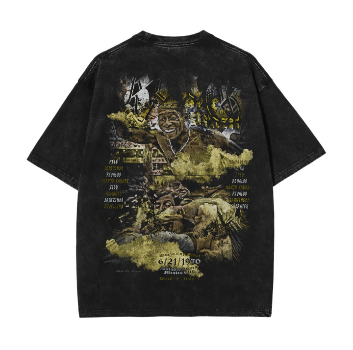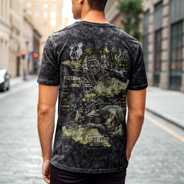 This vintage Brazil football tee is a celebration of the nation’s unmatched legacy, with the front design capturing pure joy and flair in gritty, electric tones. The back honors iconic legends like Pelé and the unforgettable 1970 World Cup triumph, blending gold-washed textures with chaotic brilliance—just like the beautiful game played the Brazilian way.