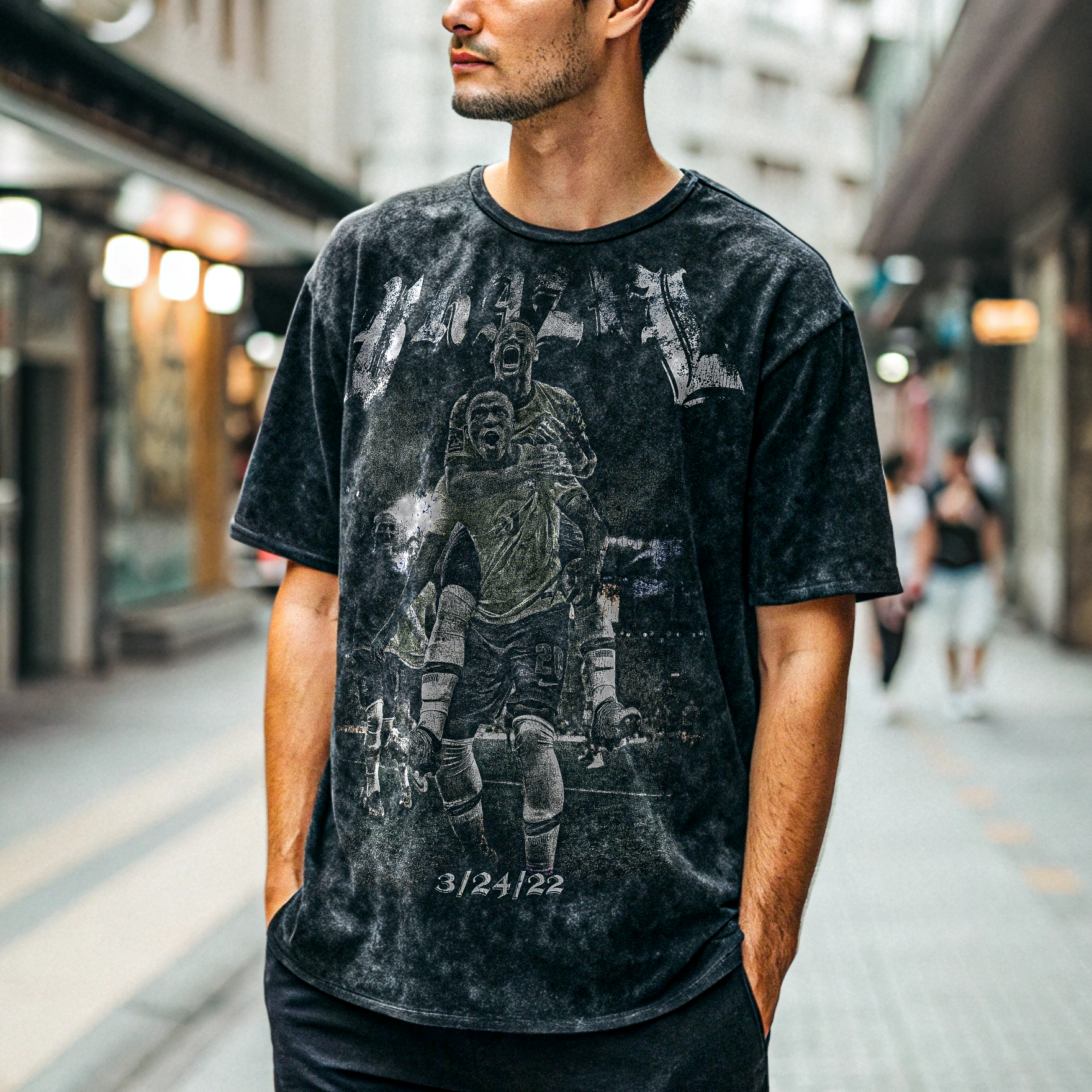 Effortlessly vintage and street-ready, our oversized acid wash football tees blend pure cotton comfort with bold graphic flair. Designed for unisex wear and built from 100% cotton with a moderate weight and slight stretch, each shirt features a drop-shoulder fit, large front print, and signature snow-washed finish. Perfect for casual days, outdoor hangs, or post-game style—this tee is your go-to for relaxed summer vibes. Due to our unique wash process, slight variations make every piece one of a kind.