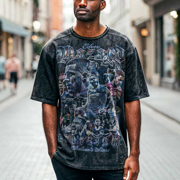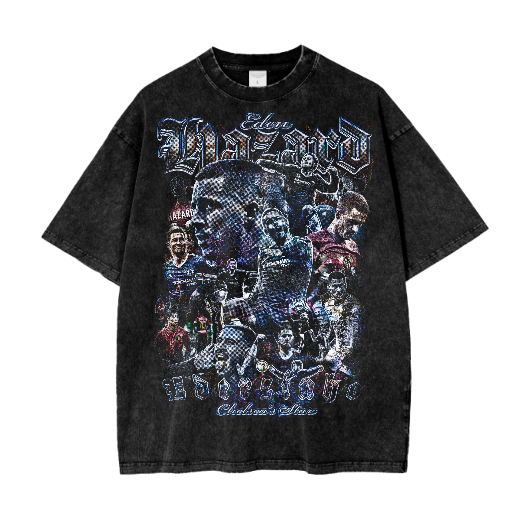 This vintage Eden Hazard tee explodes with dynamic energy, capturing the Belgian maestro in a flurry of fearless dribbles, goals, and signature flair. The front design bursts with color and layered action shots from his Chelsea prime, while the back features a triumphant pose framed by bold gothic lettering—celebrating a player whose creativity and explosiveness made defenders tremble.