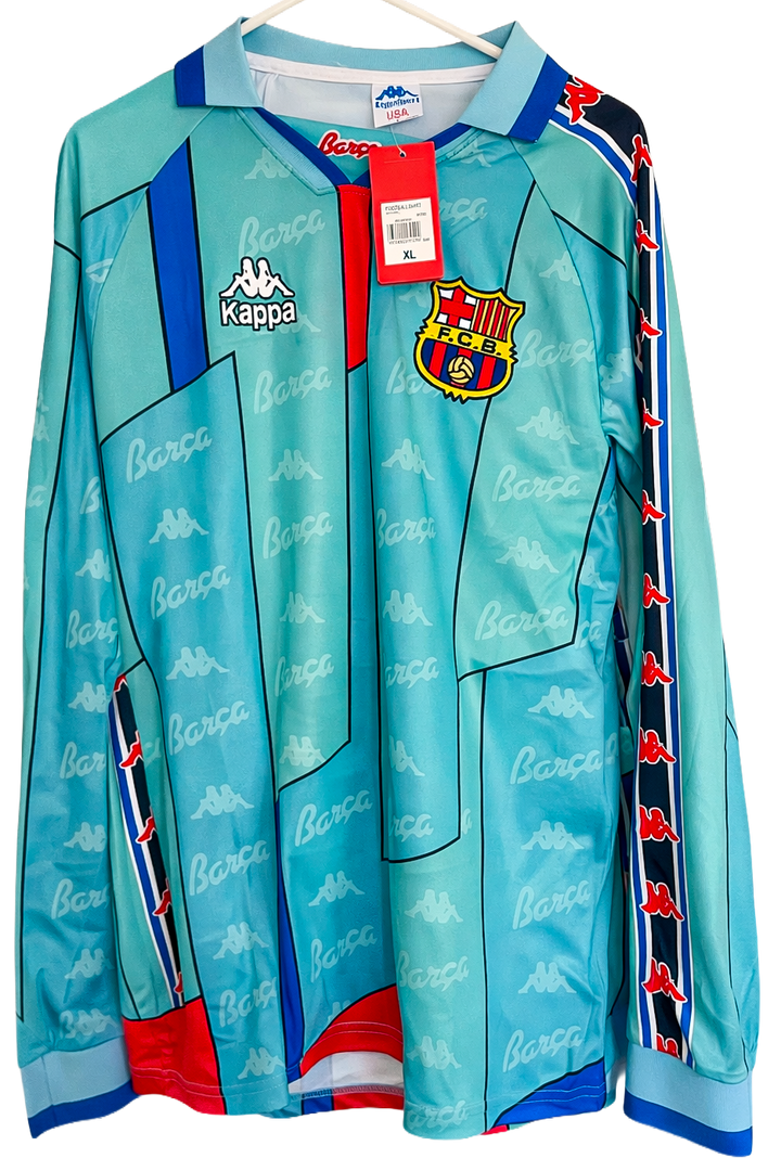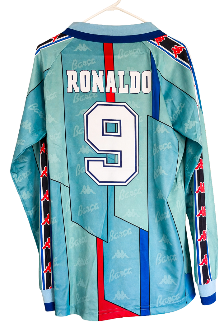 An iconic piece of football history, this FC Barcelona 1996/97 away jersey celebrates the legendary season of Ronaldo Nazário, one of the greatest strikers the game has ever seen. Featuring the classic teal colorway with bold graphic detailing, this shirt represents the era when El Fenómeno took La Liga by storm.
