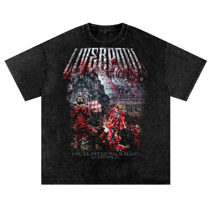 This graphic tee captures the intensity and identity of Liverpool FC through a bold, layered design inspired by the club’s history and atmosphere. Deep reds, distressed textures, and iconic imagery come together to reflect Anfield’s energy and the passion of the supporters. The collage-style artwork gives the shirt a raw, vintage edge while paying homage to one of football’s most storied clubs. A statement piece made for those who carry Liverpool’s legacy beyond the pitch.