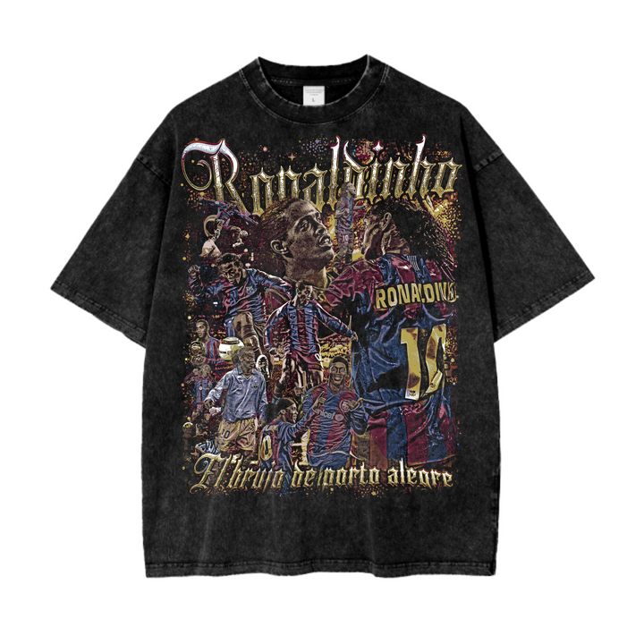 This vintage graphic tee is a bold tribute to the magic of Ronaldinho, capturing his charisma and genius with a collage of iconic moments in vivid detail. From the golden lettering to the rich, layered visuals of his Barcelona days, the design radiates the joy, creativity, and flair that defined one of football’s most electrifying legends.