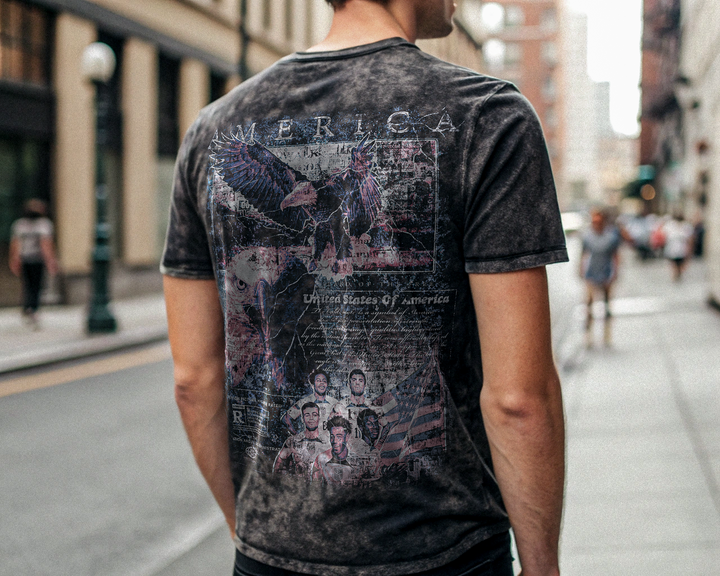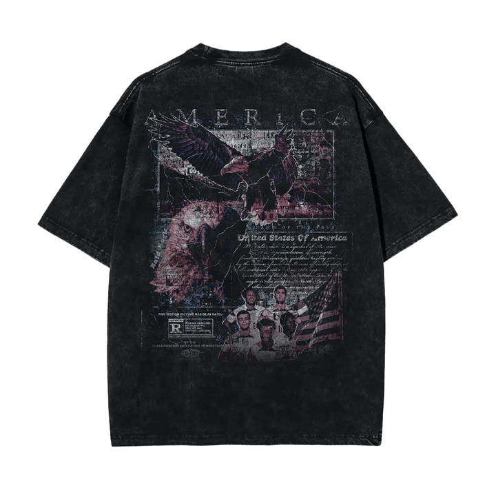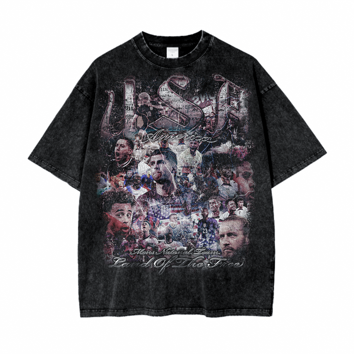 This bold vintage tee celebrates the U.S. Men's National Soccer Team with a dynamic collage of iconic players and intense moments from the pitch. Set against a black acid-washed background, the oversized front graphic bursts with energy, while the back features a gritty patriotic design with soaring eagles, American text, and a retro movie-poster style tribute to the team. A true homage to American football culture, perfect for fans who rep the red, white, and blue with pride.
